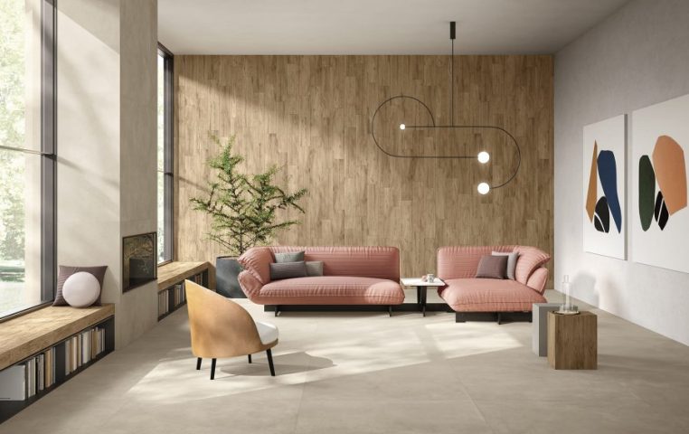 Phong cách Nhật – Hàn khiến gạch vân gỗ trở thành “ngôi sao mới” trong nội thất phòng khách.